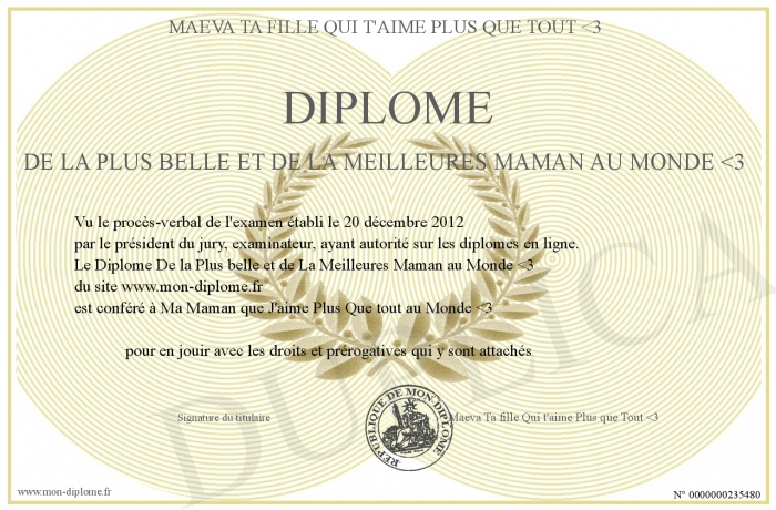 Envoyez par email votre Diplôme De la Plus belle et de La Meilleures Maman au Monde -3 personalisé