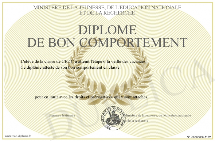 Envoyez par email votre Diplôme de bon comportement personalisé