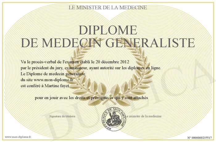 Envoyez par email votre Diplôme de medecin generaliste personalisé
