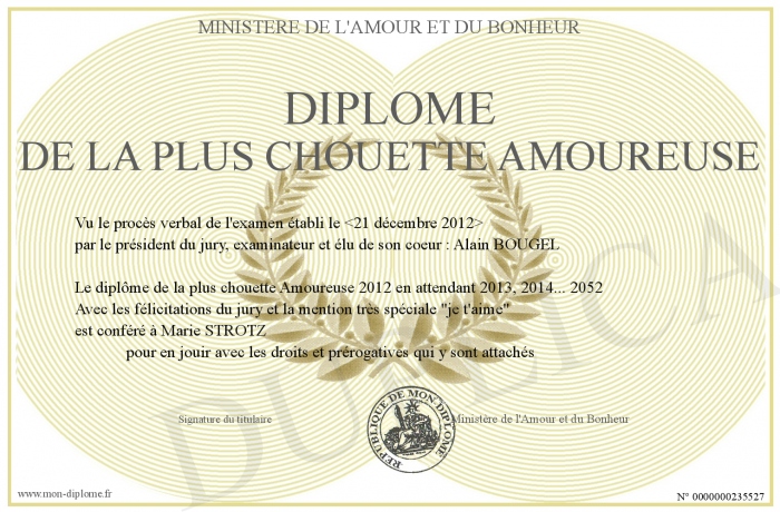 Envoyez par email votre Diplôme de la plus chouette Amoureuse personalisé