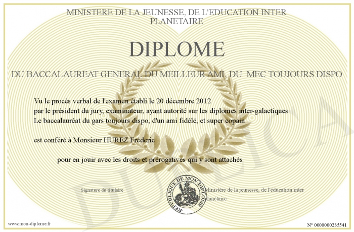 Envoyez par email votre Diplôme du baccalaureat général du meilleur ami, du mec toujours dispo personalisé