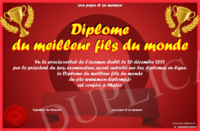 Envoyez par email votre Diplôme du meilleur fils du monde personalisé