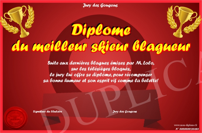 Envoyez par email votre Diplôme du meilleur skieur blagueur personalisé