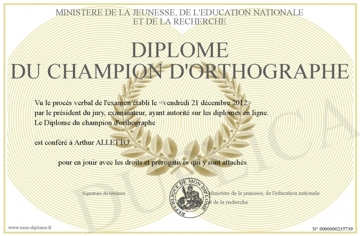 Envoyez par email votre Diplôme du champion d'orthographe personalisé