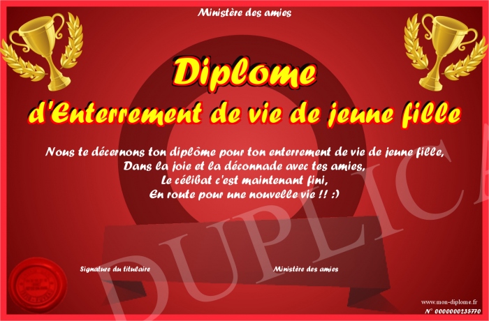 Envoyez par email votre Diplome d'Enterrement de vie de jeune fille personalisé