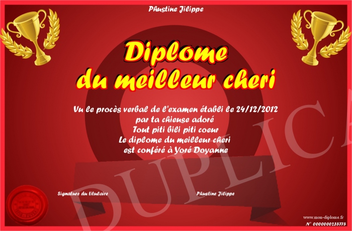 Envoyez par email votre Diplôme du meilleur cheri personalisé