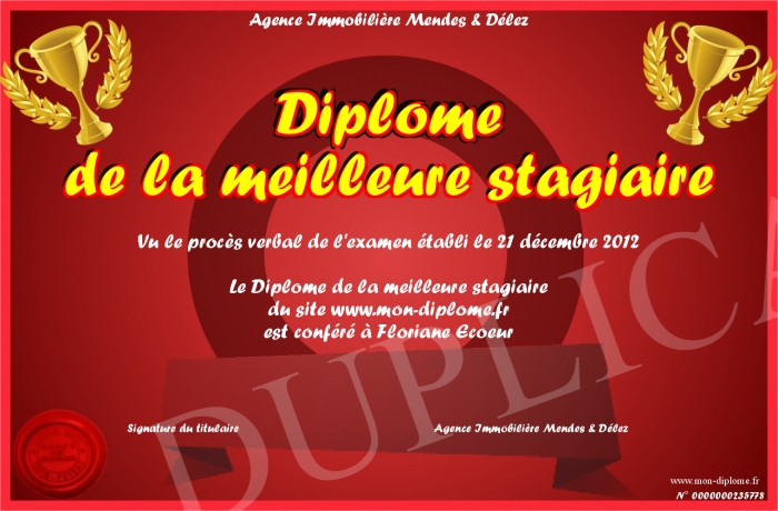 Envoyez par email votre Diplôme de la meilleure stagiaire personalisé