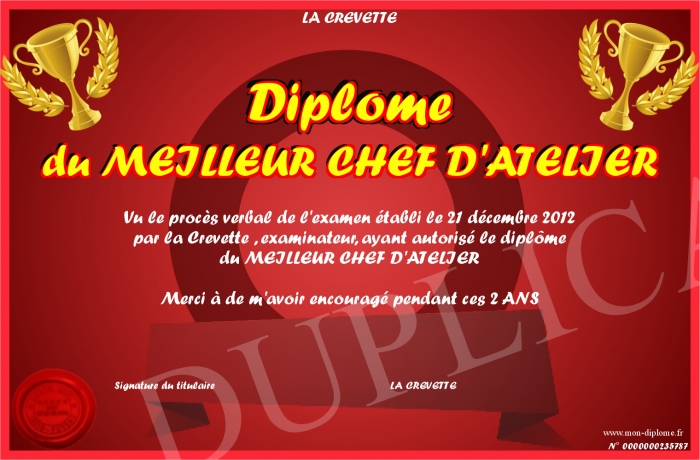 Envoyez par email votre Diplôme du MEILLEUR CHEF D'ATELIER personalisé