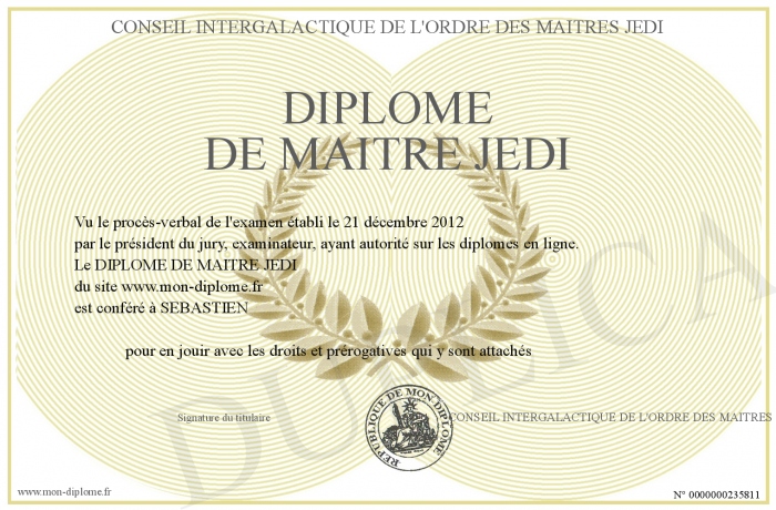 Envoyez par email votre DIPLOME DE MAITRE JEDI personalisé