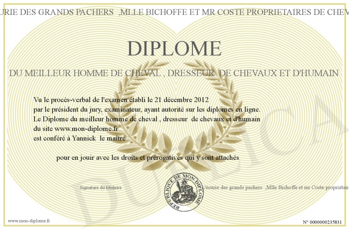 Envoyez par email votre Diplôme du meilleur homme de cheval , dresseur de chevaux et d'humain personalisé