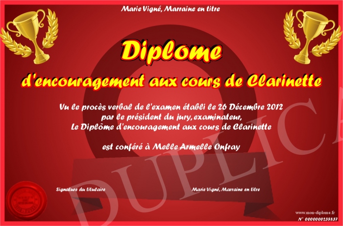 Envoyez par email votre Diplôme d'encouragement aux cours de Clarinette personalisé