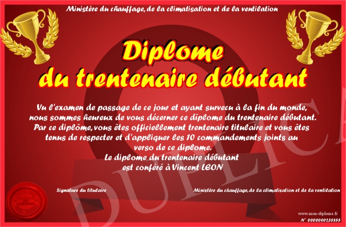 Envoyez par email votre Diplôme du trentenaire débutant personalisé