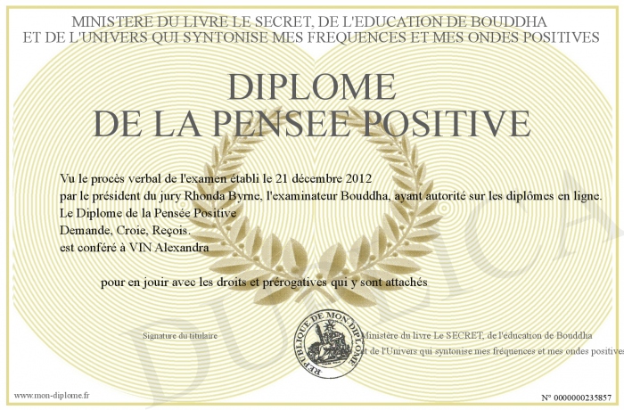 Envoyez par email votre Diplôme de la Pensée Positive personalisé