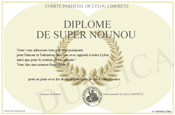 Envoyez par email votre Diplôme de Super Nounou personalisé