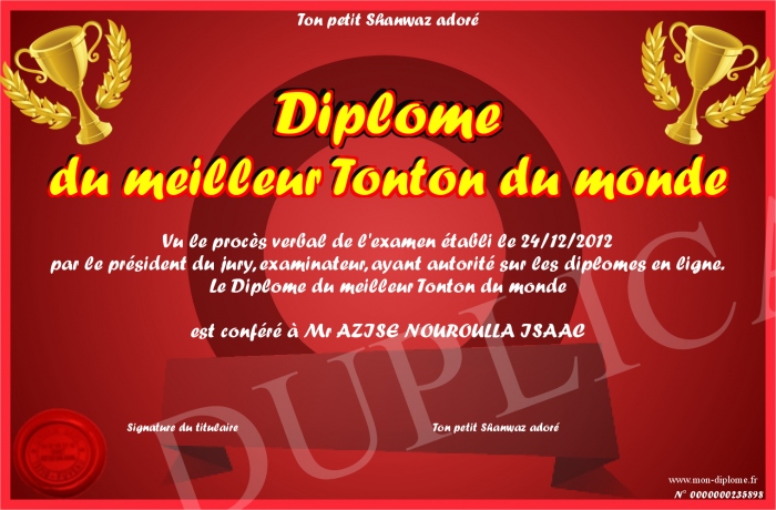 Envoyez par email votre Diplôme du meilleur Tonton du monde personalisé