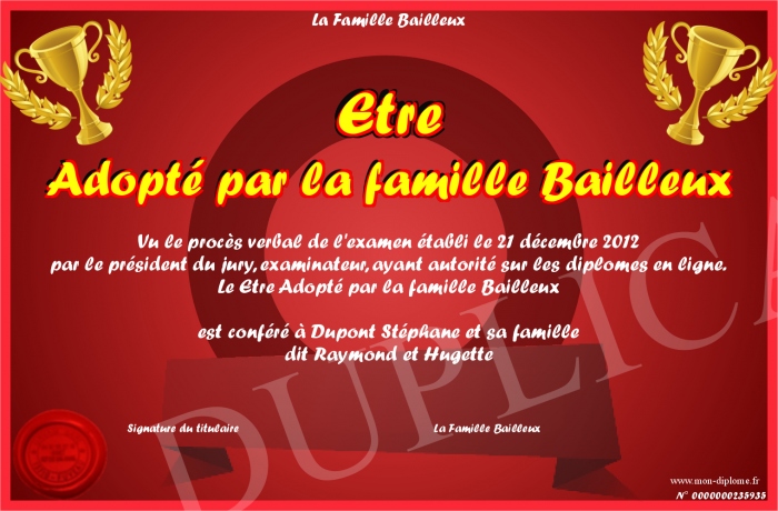 Envoyez par email votre Etre Adopté par la famille Bailleux personalisé