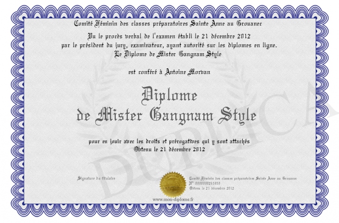 Envoyez par email votre Diplôme de Mister Gangnam Style personalisé