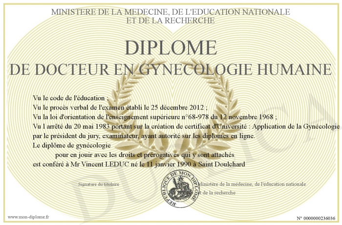 Envoyez par email votre Diplôme de Docteur en Gynécologie Humaine personalisé