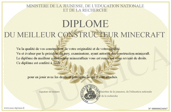 Envoyez par email votre Diplôme du meilleur constructeur minecraft personalisé