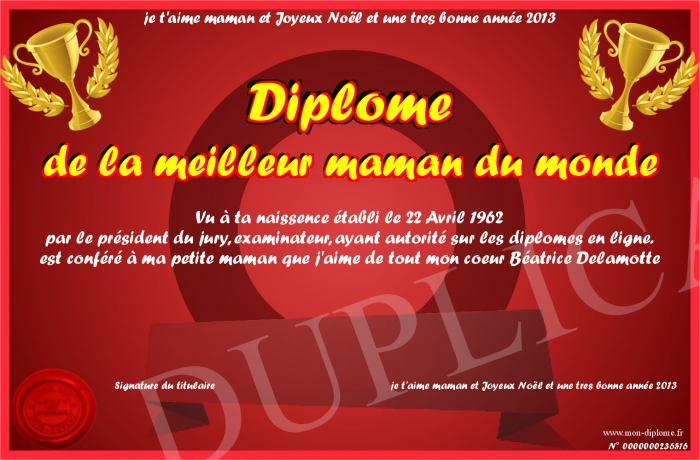 Envoyez par email votre Diplôme de la meilleur maman du monde personalisé