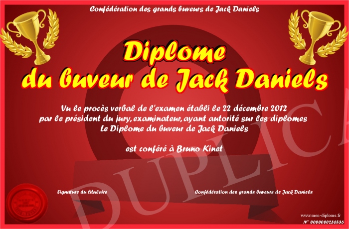 Envoyez par email votre Diplôme du buveur de Jack Daniels personalisé