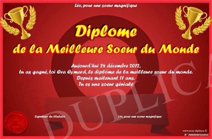 Envoyez par email votre Diplôme de la Meilleure Soeur du Monde personalisé