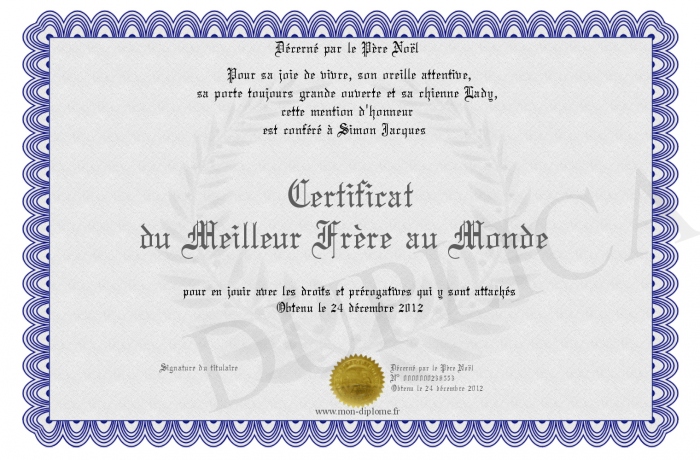 Envoyez par email votre Certificat du Meilleur Frère au Monde personalisé