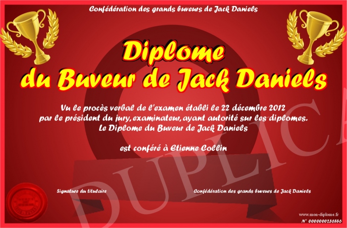 Envoyez par email votre Diplôme du Buveur de Jack Daniels personalisé