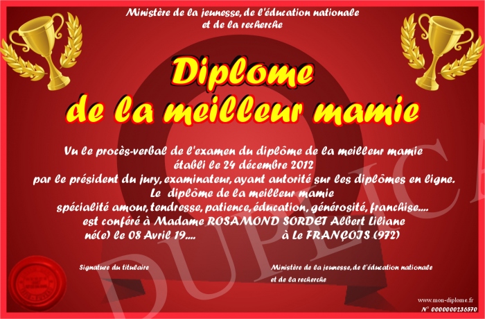 Envoyez par email votre Diplôme de la meilleur mamie personalisé
