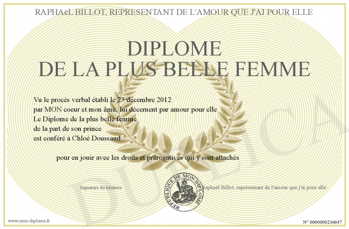 Envoyez par email votre Diplôme de la plus belle femme personalisé