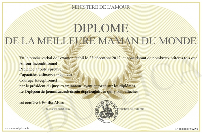 Envoyez par email votre Diplôme de la meilleure Maman du monde personalisé