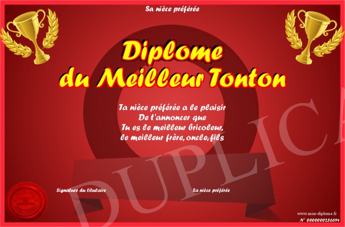 Envoyez par email votre Diplôme du Meilleur Tonton personalisé