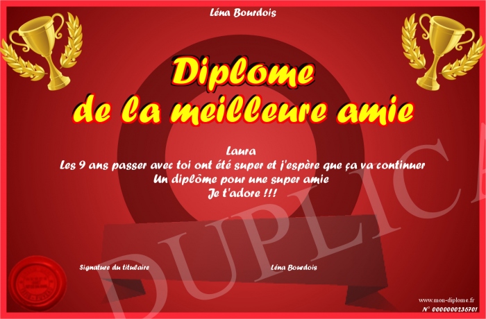 Envoyez par email votre Diplôme de la meilleure amie personalisé
