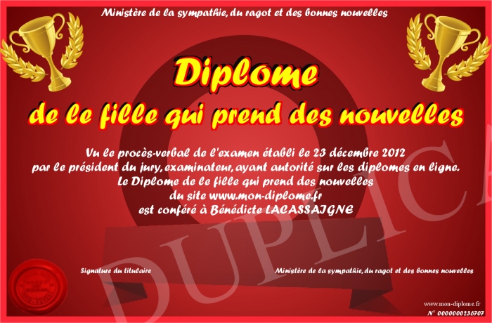 Envoyez par email votre Diplôme de le fille qui prend des nouvelles personalisé