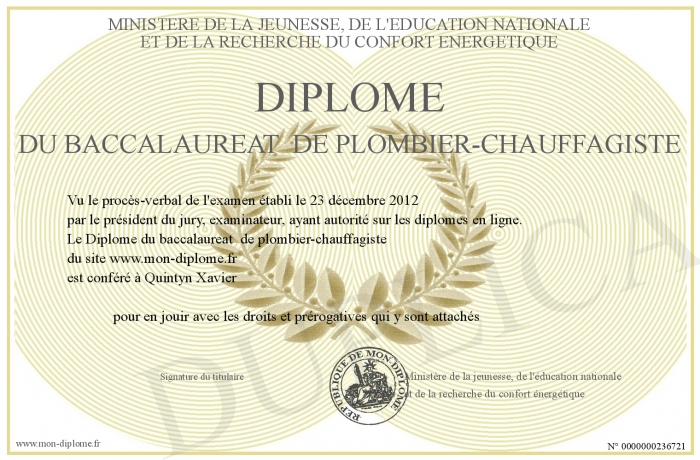 Envoyez par email votre Diplôme du baccalaureat de plombier-chauffagiste personalisé