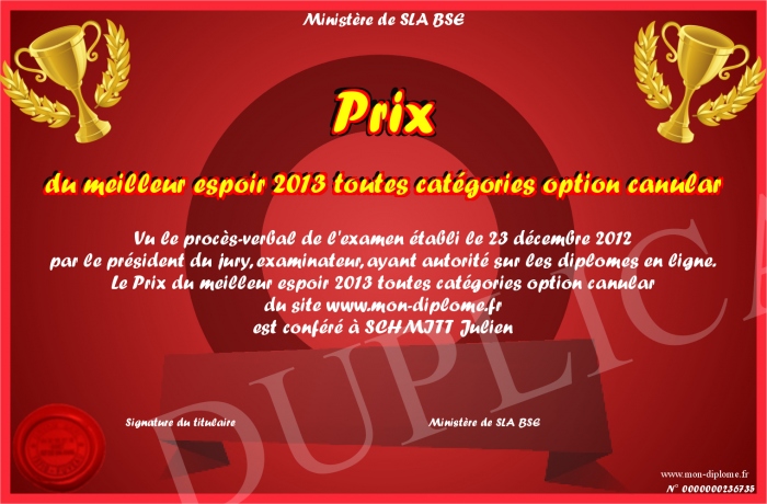 Envoyez par email votre Prix du meilleur espoir 2013 toutes catégories option canular personalisé