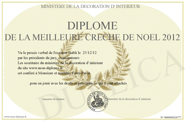 Envoyez par email votre Diplôme de la meilleure crèche de Noel 2012 personalisé