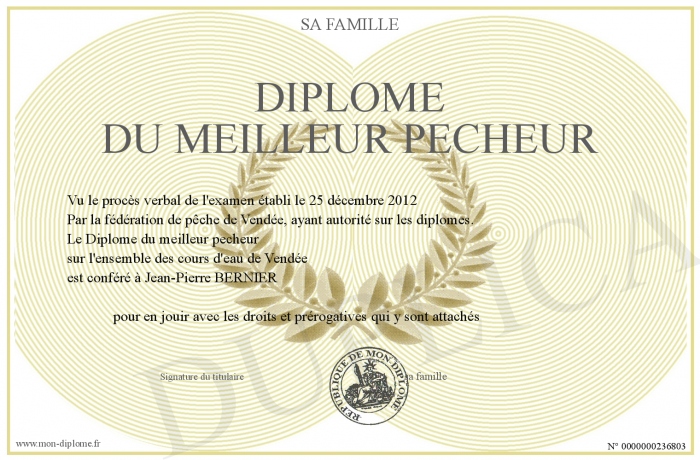 Envoyez par email votre Diplôme du meilleur pecheur personalisé