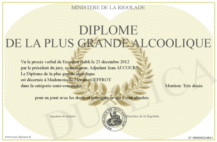 Envoyez par email votre Diplôme de la plus grande alcoolique personalisé