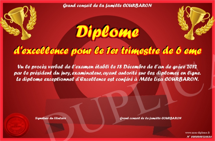 Envoyez par email votre Diplôme d'excellence pour le 1er trimestre de 6 eme personalisé