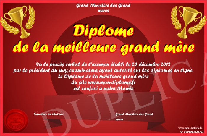 Envoyez par email votre Diplôme de la meilleure grand mère personalisé