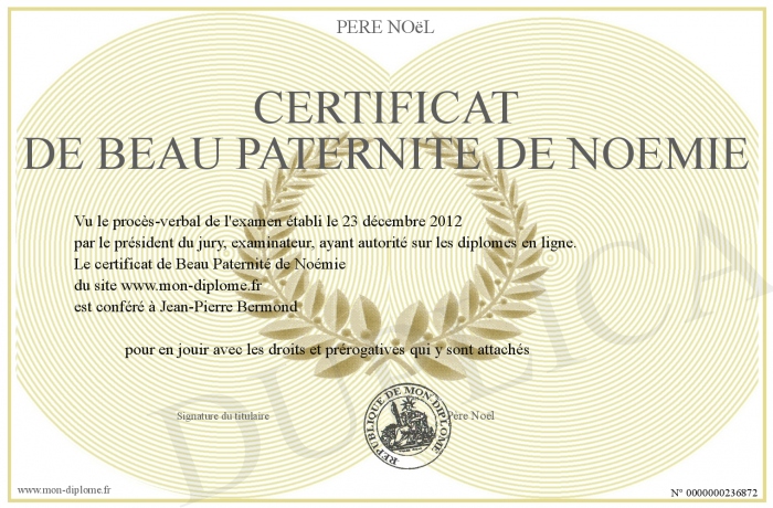 Envoyez par email votre certificat de Beau Paternité de Noémie personalisé