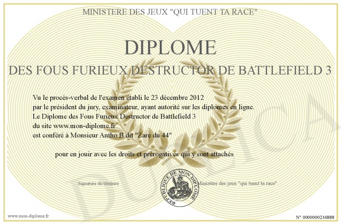 Envoyez par email votre Diplôme des Fous Furieux Destructor de Battlefield 3 personalisé