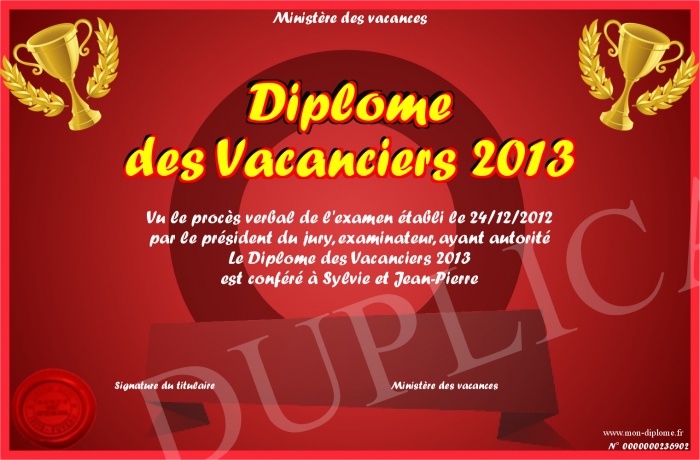 Envoyez par email votre Diplôme des Vacanciers 2013 personalisé