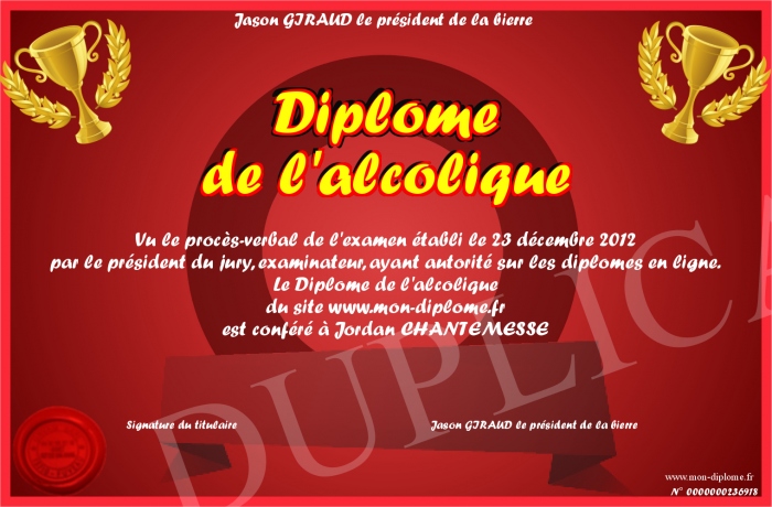 Envoyez par email votre Diplôme de l'alcolique personalisé