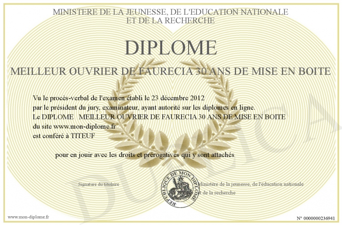 Envoyez par email votre DIPLOME MEILLEUR OUVRIER DE FAURECIA 30 ANS DE MISE EN BOITE personalisé