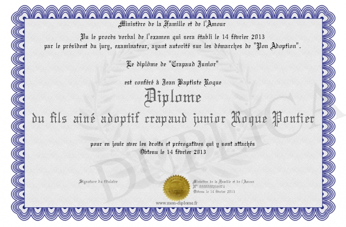 Envoyez par email votre Diplôme du fils ainé adoptif crapaud junior Roque Pontier personalisé