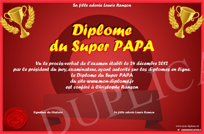 Envoyez par email votre Diplôme du Super PAPA personalisé
