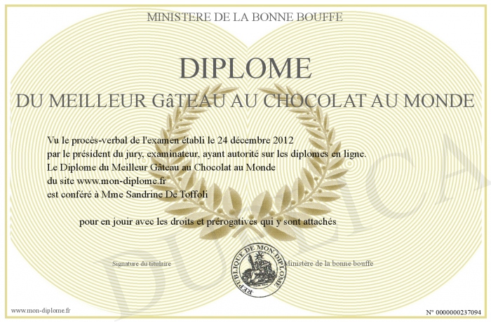 Envoyez par email votre Diplôme du Meilleur Gâteau au Chocolat au Monde personalisé