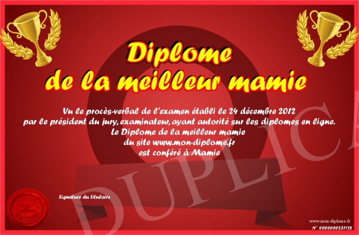 Envoyez par email votre Diplôme de la meilleur mamie personalisé